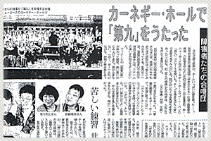 東京都豊島区の福祉施設「ゆきわりそう」に通う障害者や家族、介助者を中心とした約350人の合唱団が、米・ニューヨーク市のカーネギー・ホールでベートーベンの「第九」コンサートを開いた。テープを聴きながら「音」で歌詞を覚えた人がいる。投げ出したくなる気持ちを支えあった二人組みも。約2000人の聴衆からの拍手は、人生に立ち向かう自信になった。